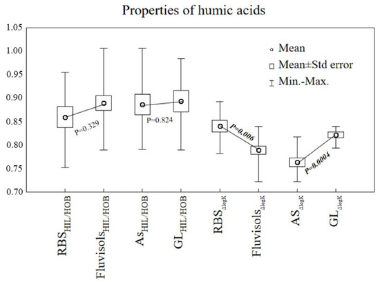 HA molecules isolated from arable soils exhibited the lowest susceptibility to oxidation—with a mean of 51.2% (Table 1). Similar average values of susceptibility to oxidation, at the level of 57.3–57.5%, were obtained for humic acids extracted from grasslands and riverbank sediments (Table 1). According to Drąg et al. [59], the aliphatic part of humic acid molecules is more susceptible to oxidation, while the aromatic part is more resistant. This is confirmed by the significant differences between arable land and grassland humic acids (p = 0.002). The analysis of variance between the susceptibility to oxidation of HAs from riverbank sediments and those from Fluvisols did not confirm the relationship seen in the A2/4, A2/6, A4/6 absorbance coefficients (Table 1).