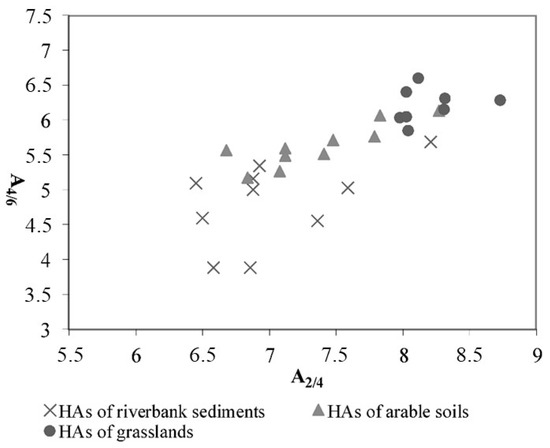 The A2/4, A2/6, A4/6 ratio values were significantly lower for the HAs isolated from riverbank sediments than for the Fluvisols’ humic acids (Table 1). This evidences the highest level of humification among the HA molecules. It is worth noting that the humic acids of the grasslands had a lower degree of humification than did those of the arable soils—with significantly higher values of A2/4, A2/6, A4/6 (Table 1). The obtained relationships between the values of the ratio A4/6 from A2/4 confirmed that the method of soil use determined the spectrometric properties of HAs (Figure 4).