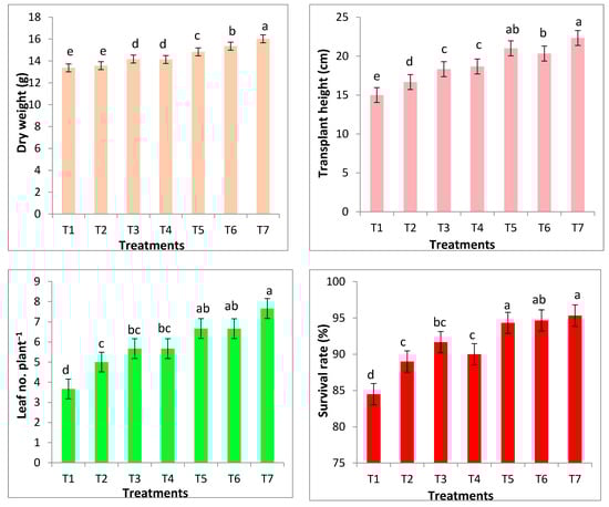 Effect of different concentrations of nano-Se and nano-Cu on some vegetative growth of banana transplants (dry weight, height, leaves number per plant), survival rate %. (Abbreviations: T1, T2, T3, T4 and T5 represent control, 25, 50, 75, 100 mg L−1 nano-Se, respectively, whereas T6 and T7 represent 50, 100 mg L−1 nano-Cu. Values are means ± standard deviation (SD) from three replicates.) Columns have the same letter are not significant according to Duncan’s multiple range test at p ≤ 0.05.