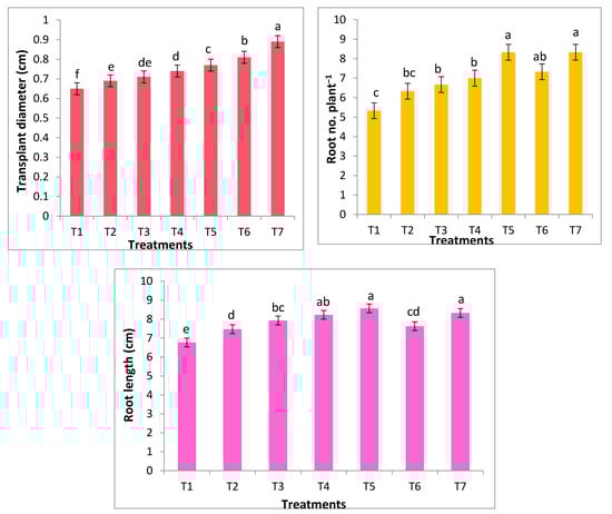 Experiments were established in highly randomized design, with three replicates for each treatment. Ten transplants were used to reflect each replicate. Observations on acclimatized plants were recorded after 45 days of culture. SPSS software was used to perform a variance analysis on the data (version 20; IBM Corp., Armonk, NY, USA). Duncan’s multiple range testing method was used to perform the mean separations, and significance was determined at p ≤ 0.05.