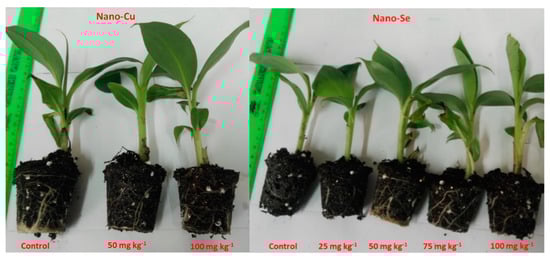 Banana (Musa spp.) is significant fruit crop cultivated in the tropical and sub-tropical regions [] with a high yield production (up to 35 Mg ha−1) and high requirement of NPK-fertilizers, ranging from 0.19–0.34, 0.022–0.146, and 0.73–1.26 Mg ha−1[,,]. Banana is classified economically as the fifth most important agricultural crop in global trade []. Banana fruits have excellent nutritional value due to their high content of carbohydrates, minerals (K, P, Ca, Mg, and Fe), and vitamins like riboflavin (B2), niacin (B3), A, C and B6 [,]. The growth, rooting and acclimatization of micropropagated banana transplants may be controlled by many factors like endophytic micro-organisms [], aseptic environments [], nutrients such as magnesium [], potassium, and nitrogen [], and growth media content []. Micropropagated banana transplants should have high health and be cultivated in suitable artificial culture media, free from diseases and pests to guarantee a high production []. The acclimatization of in vitro grown banana plantlets is a very important step for commercial production in an ex-vitro environment by hardening for high quality banana transplants as followed for several horticultural crops like orchid []. As far as we know, this is the first report about the rooting and acclimatization of microprogrammed banana under the fertilization of Se and/or Cu bio-nanofertilizers.