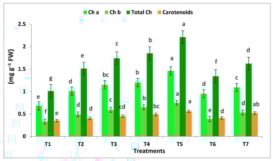 Effect of different concentrations of nano-Se particles on Ch a, Ch b, total Ch and carotenoids in banana leaves. (Abbreviations: T1, T2, T3, T4 and T5 represent control, 25, 50, 75, 100 mg L−1 nano-Se, respectively, whereas T6 and T7 represent 50, 100 mg L−1 nano-Cu. Values are means ± standard deviation (SD) from three replicates). Columns have the same letter are not significant according to Duncan’s multiple range test at p ≤ 0.05.