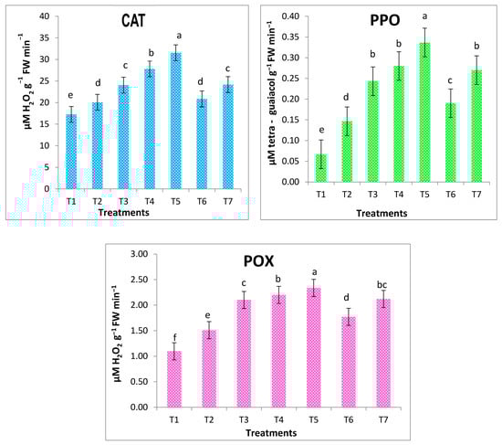 A total of 0.5 g of fully expanded leaves were homogenized in liquid nitrogen with 3 mL of extraction buffer 50 mM TRIS buffer (pH 7.8), adding 1 mM EDTA-Na2 and 7.5% polyvinylpyrrolidone to measure antioxidant enzymatic activities. Using a previously chilled mortar and pestle, the homogenate was centrifuged at 12,000 rpm for 20 min at 4 °C after being filtered through four layers of cheesecloth. According to Hafez et al. [], supernatant was re-centrifuged at 12,000 rpm for 20 min at 4 °C to determine total soluble enzyme activity utilizing UV-spectrophotometer (160 A—Shimadzu, Japan). Catalase (CAT), polyphenol oxidase (PPO), and peroxidase (POX) activities were determined [,,] using three replicates.
