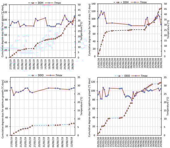 Cumulative degree-days for heat stress (DDH) and optimum growth (DDO) according to heat threshold temperature (29 °C) and daily maximum temperatures (Tmax) during flowering and pod setting stages in the 2019 and 2020 growing seasons.
