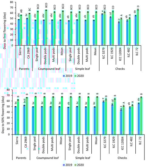Comparison of compound-leafed versus simple-leafed and multi-podded versus double-podded and single-podded chickpeas with parents and checks for phenological traits. Different lowercase letters and uppercase letters represent the significant difference (p ≤ 0.05) between the means for 2019 and 2020, respectively.