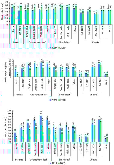 Comparison of compound-leafed versus simple-leafed and multi-podded versus double-podded and single-podded chickpeas with parents and checks for plant height, pods and seeds per plant. Different lowercase letters and uppercase letters represent the significant difference (p ≤ 0.05) between the means for 2019 and 2020, respectively.