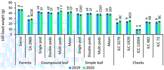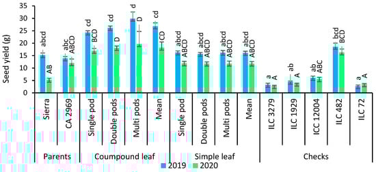 Comparison of compound-leafed versus simple-leafed and multi-podded versus double-podded and single-podded chickpeas with parents and checks for seed yield and 100-seed weight. Different lowercase letters and uppercase letters represent the significant difference (p ≤ 0.05) between the means for 2019 and 2020, respectively.