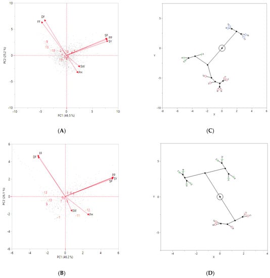 Principal component analysis (PCA) was performed to examine how chickpeas were classified according to leaf shape and pods per axil, parents, and checks. PCA results showed that the maximum variation was contributed by yield parameters such as seeds per plant (SP), pods per plant (PP), and seed yield (SY) for PC1, and phenological traits such as days to flowering (DF) and days to 50% flowering (FF) for PC2 (Figure 6A,B).