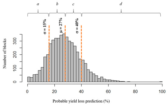 Figure 9 shows the distribution of the yield loss prediction when the N-PLS model calibrated with the 107 vineyard blocks is applied to 4978 vineyard blocks of the region. From the mean (μ) and the standard deviation (σ) values of the distribution, four classes of yield loss were defined as follows: predictions between 0 and 15% yield loss represented a low impact (a), predictions between 15 and 27% of losses represented a moderate impact (b), predictions between 27 and 40% of losses represented a high impact (c), and predictions > 40% represented a severe impact of heat stress (d).