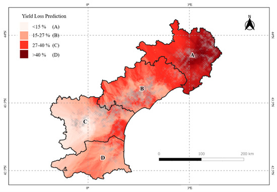 Yield loss estimations at the regional scale were interpolated following a classical kriging process (Section 2.4). Estimations were analysed both qualitatively from visual comparison with the maximum temperature record map of the 28 June 2019 (Figure 3), and quantitatively, based on the occurrence of predicted yield loss values with respect to the maximum temperature recorded over the block. As validation, a chi-square test of independence [26] was used to verify the dependency between both information sources at the regional scale. The H₀ hypothesis was that yield loss estimation was independent of maximal temperature recorded during the heatwave event. H₀ was rejected for p-values of 0.05 (p < 0.05).