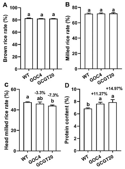 Milling and nutritional quality of GOC4, GCGT20, and WT rice grains. (A) Brown rice rate, (B) milled rice rate, (C) head rice rate, and (D) protein content. Data are presented as the mean ± SD according to one-way ANOVA followed by a Duncan’s test for means comparison. Different letters indicate significant differences (n = 4, p < 0.05).