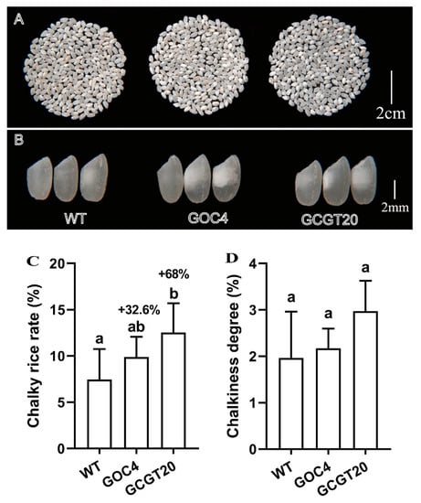 Appearance quality of GOC4, GCGT20, and WT rice grains. The appearance quality includes (A,B) the performance of the milled grain, (C) chalky rice rate, and (D) chalkiness degree. Data are presented as the mean ± SD according to one-way ANOVA followed by a Duncan’s test for means comparison. Different letters indicate significant differences (n = 4, p < 0.05).