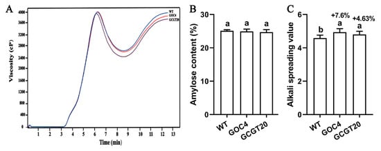 Cooking quality of GOC4, GCGT20, and WT rice grains. The cooking quality includes (A) the starch RVA curve, (B) amylose content, and (C) alkali spreading value. Data are presented as the mean ± SD according to one-way ANOVA followed by a Duncan’s test for means comparison. Different letters indicate significant differences (n = 4, p < 0.05).