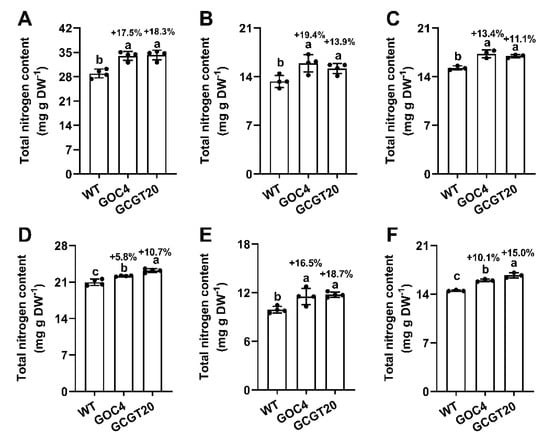 Total nitrogen contents of flag leaf, stem sheath, and panicle in GOC4, GCGT20, and WT plants at blooming and maturity stages. (A) Flag leaves at blooming stage; (B) stem sheath at blooming stage; (C) panicle at blooming stage; (D) flag leaves at maturity stage; (E) stem sheath at maturity stage; (F) panicle at maturity stage. Data are presented as the mean ± SD according to one-way ANOVA followed by a Duncan’s test for means comparison. Different letters indicate significant differences (n = 4, p < 0.05).