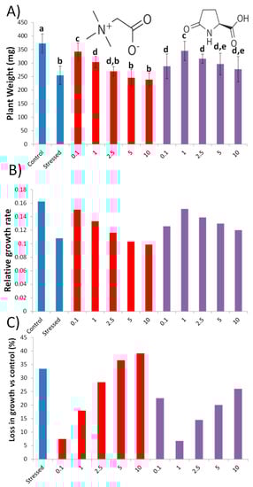Hydroponic culture was employed as previously described but using maize with 20% polyethylene glycol (PEG) as a stressor instead of tomato with salt [26]. The treatment was applied for 24 h directly to the roots using 0.1, 1, 2.5, 5 and 10 mM GB or PG dissolved in distilled water. Then, the plants were placed again in the hydroponic buckets for the next 24 h. After this time, the medium was changed, and by adding 20% PEG, the onset of the stress was triggered. A control group without any treatment or PEG was used as a reference of normal maize growth. Ten plants were weighed at the beginning of the experiment to set up T0, and the others submitted to different conditions were weighed after one week of growth. Plants were oven-dried at 65 °C for two days and used to calculate the RGR [27]. The concentrations that achieved the best result for this parameter and the consecutive lower doses were used in the followed experiment.