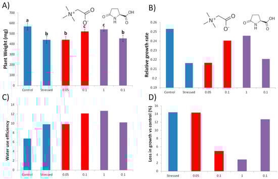 To ensure absorption after root treatment, we applied the compound directly to the soil in nursery trials. Watering with 50% less water for one week decreased maize growth by 14% (Figure 2). This situation was prevented by applying GB and PG, which increased tolerance by 65 and 85% at 0.1 and 1 mM, respectively. Water use efficiency was higher in all plants subjected to this slight water stress. The biostimulants achieved better results, showing more effectiveness in stress adaptation (Figure 2C).