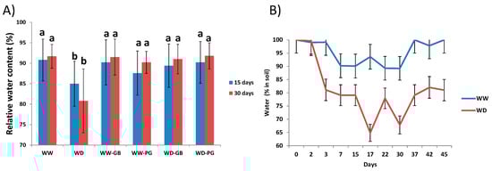 Treatments with biostimulants prevented growth losses, as indicated by the RWC value (Figure 3A). Untreated plants subjected to water deficit showed drops in RWC after fifteen days, and this trend continued after 30 days of the two watering regimes; both biostimulant treatments prevented this. The results are consistent with soil water content (Figure 3B); the soil dried to 80% of the humidity level only after 3 days of stress onset. Then, it was more or less stable throughout the experiment, with two periods of more intense water deficit, reaching 65% of the moisture level, which was translated into a lower RWC except for the plants treated with biostimulants.