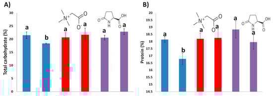 Total carbohydrate percentage (Figure 4A) was significantly reduced by the reduced irrigation and was prevented with the addition of GB and PG. The same correlation was shown for the protein percentage; the water deficit significantly affected only the plants without treatment and subjected to stress (Figure 4B).