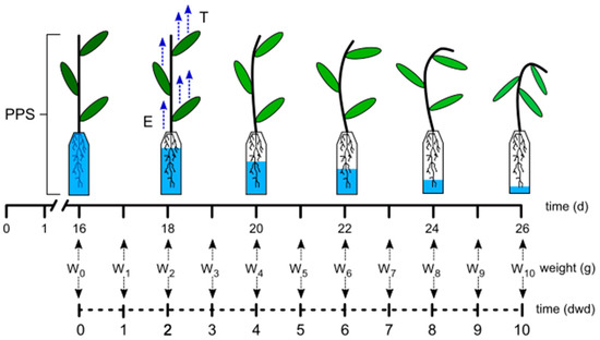 Schematic illustration of the experiment for determining water consumption. Plants were maintained at field-capacity condition until day 16, after which the water supply was suspended. The Plant Pot Substrate system (PPS) was weighted daily for 10 days ( until ). Evaporation: ; transpiration: ; days of water deficit: dwd.
