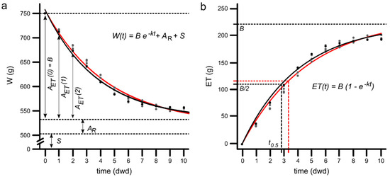 (a) Empirical model representing evapotranspiration over time and the empirical model adjustment. Weight () of the PPS along the days of water deficit (dwd). Sum of dry weight substrate, pot, and plant weight (), residual water (), evapotranspirable water (), and potential evapotranspiration () of plants at field-capacity conditions. (b) Mathematical analysis for modeling as a function of time. The parameter is the time required for the PPS to halve the potentially evapotranspirable water.