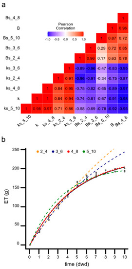 Minimum sampling requirements analysis and adjustment of model. (a) Relation between K or B estimated by the Gauss Newton method and the predicted K or B generated by analytic methods with two-time sampling, respectively. Axis indicates the parameters and the days of the sampling. (b) ET over time. Graphic representation of Equation (7) adjusted according to the data of the numeric (solid curve) or analytic methods (dashed colored curve). Colors indicate the two specific sampling days used for modeling the curve. Days of water deficit: dwd.