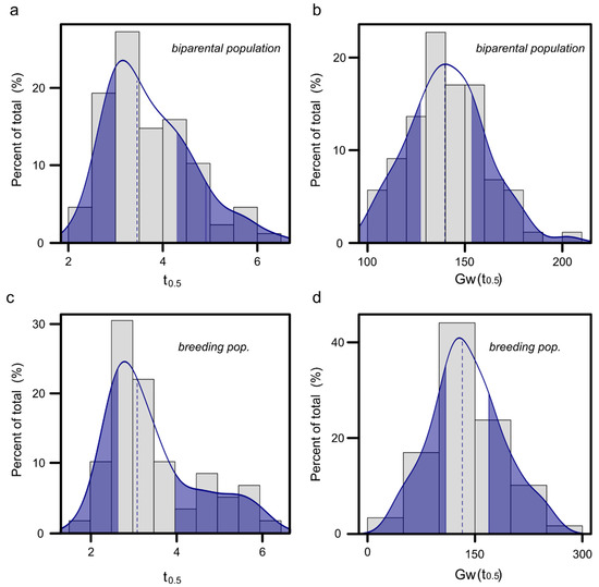 Graphic distribution of t0.5 and Gw(t0.5) values obtained from two soybean populations. t0.5 is expressed in days and Gw(t0.5) in mmol H2O m2 s−1. A frequency analysis was performed in 177 and 89 genotypes of a biparental and breeding population, respectively. The darker regions represents the 25% of the genotypes with superior and inferior t0.5 and Gw(t0.5) values of the populations. (a,b) biparental population; (c,d) breeding population.