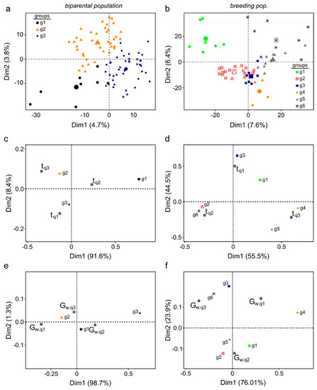Population structure calculated from genotypic data (molecular markers), phenotypic data (parameters of the model), and the correspondence analysis. The groups were obtained by hierarchical clustering on the principal component (HCPCgenotypic). (a) Biparental population: g1, g2, and g3 groups. (b) Breeding population: g1, g2, g3, g4, g5, and g6 groups. Correspondence analysis of the contingency table between groups based on the parameters of the models and groups according to genotype. (c,e) Biparental population. (d,f) Breeding population. Population structure calculated from parameters t0.5 and Gw of the model. tqn and Gwqn were obtained by hierarchical clustering on the principal component (HCPCphenotypic).
