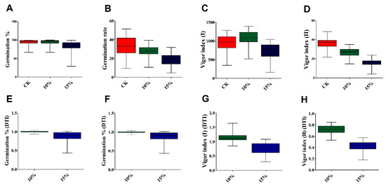Box and whisker charts showing variation in germination-related traits: (A) final germination %, (B) germination rate, (C) vigor index (I) and (D) vigor index (II), under CK, 10%, and 15% PEG-6000 treatments. Reduction in DTI values of (E) final germination %, (F) germination rate, (G) vigor index (I), and (H) vigor index (II) under drought stress in rapeseed seedlings.