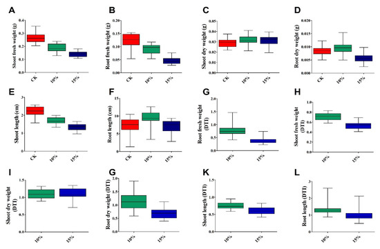 Box and whisker charts showing the variation of traits. (A) shoot fresh weight, (B) root fresh weight, (C) shoot dry weight, (D) root dry weight, (E) shoot length, (F) root length in rapeseed seedlings under control, 10%, and 15% PEG-6000 treatments. Boxplots illustrate reduction in DTI values of (G) shoot fresh weight, (H) root fresh weight, (I) shoot dry weight, (J) root dry weight, (K) shoot length and (L) root length under drought stress in rapeseed seedlings.