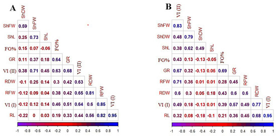 Positive correlations were also observed for most of the same 10 traits under the 10% PEG-6000 treatment, as indicated by the red and yellow cells in the correlation triangle. The r values were a little higher for some traits compared to their corresponding values under normal condition. Highly positive r-values were ≥ 0.70 for VI (II) (0.83), ShFW (0.79), RDW (0.77) and VI (I) (0.95) seedlings with ShFW, ShDW, VI (I) and RL, respectively, indicating stronger correlation. Additionally, positive r values ≥ 0.50 were scored for FG%, RFW and RDW with GR, RDW and RL, respectively. Lower values were observed for ShL, ShDW with all traits, except with ShL (Figure 3B). Furthermore, VI (II) was highly correlated with ShFW and FG% with GR compared to control.