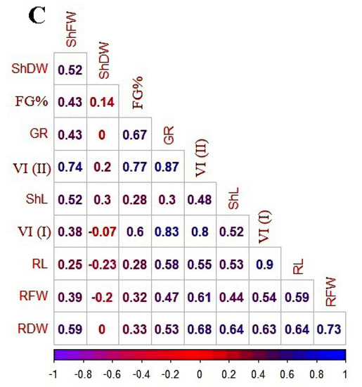 Under the 15% PEG-6000 treatment, highly positive r values were ≥ 0.70 for VI (I) (0.90) and RFW (0.73) with RL and RDW, respectively. FG% was correlated with VI (II) (0.77), while GR (r-value 0.83 and 0.87) was correlated with VI (I) and VI (II), with a stronger correlation. Meanwhile, positive r values ≥ 0.50 were recorded for ShFW with ShDW and ShL; RL with RFW and RDW, while lower values were obtained for ShDW with all attributes (Figure 3C).