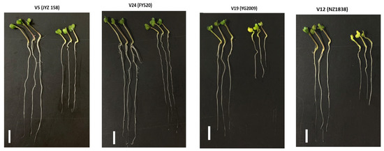 Effect of drought stress (15% PEG-6000) on the shoot and root growth of tolerant cultivars (JYZ 158 and FY 520) and sensitive cultivars (YG 2009, and NZ 1838). Scale bar: 1 cm.