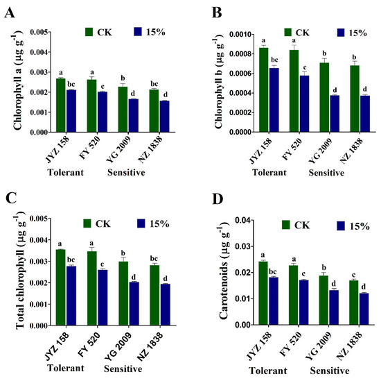 Compared to seedling growth under normal conditions, a significant decrease was noted in photosynthetic pigment levels under drought stress. Under 15% PEG-6000, Chl a content was reduced by 21.22 and 23.21% in JYZ 158 and FY 520 and decreased by 27.32 and 26.61% in YG 2009 and NZ 1838, respectively, while Chl b was decreased by 24.11% (JYZ 158), 31.30% (FY 520), 47.11% (YG 2009) and 45.40% (NZ 1838) (Figure 5A,B). Under stress, total chlorophyll in JYZ 158 and FY 520 (tolerant cultivars) was decreased by 21.93 and 25.21%, while in YG 2009 and NZ 1838 (sensitive cultivars) it was reduced by 32.00 and 31.22%, respectively (Figure 5C). Carotenoid content was reduced by 24.90% (JYZ 158), 24.80% (FY 520), 30.16% (YG 2009) and 29.02% (NZ 1838) under 15% PEG-6000 (Figure 5D).
