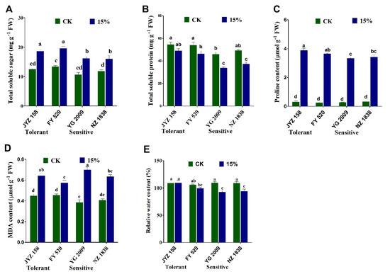 Tolerant cultivars had higher levels of TSS and TSP than sensitive cultivars. Furthermore, TSS increased by 57.50, 45.83, 48.42 and 45.51% in JYZ 158, FY 520, YG 2009 and NZ 1838 under drought stress, respectively, versus normal conditions. TSP was increased in JYZ 158 and FY 520 (tolerant cultivars), and YG 2009 and NZ 1838 (sensitive cultivars) by 14.81, 16.22, 26.72 and 24.21%, respectively, over controls in relation to drought (Figure 6A,B).