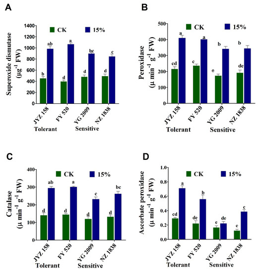 Effects of drought stress (PEG-6000 induced) on (A) superoxide dismutase (SOD), (B) peroxidase (POD), (C) catalase (CAT) and (D) ascorbate peroxidase (APX) in tolerant and sensitive rapeseed cultivars. Bars represent mean ± SE of three replicates. The different letters indicate significant differences at p < 0.05 using Duncan’s multiple range tests.