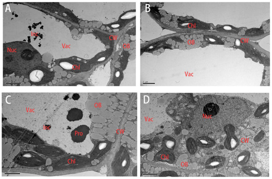 To further investigate the effects of drought stress on the chloroplast, the ultrastructure of the chloroplast in two cultivars, FY 520 (highly tolerant) and YG 2009 (highly sensitive), was observed using transmission electron microscopy (TEM). Under normal conditions, the form of chloroplast was well organized with elliptic with clear edges and was positioned near the properly developed cell wall (Figure 8A,B). Under drought stress, the shape of chloroplasts was as well-organized as in the tolerant cultivars, with well-developed lamella having normally stacked grana and thylakoids, and the cell wall had a proper configuration (Figure 8C). However, the structure of chloroplasts in leaves of sensitive cultivars was abnormal, with several vesicles instead of thylakoids, and chloroplasts moved toward the center of the cell. Non-visible and incomplete cell boundaries were observed in sensitive cultivars under drought treatment (Figure 8D).