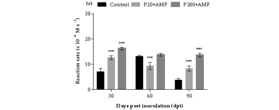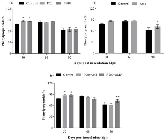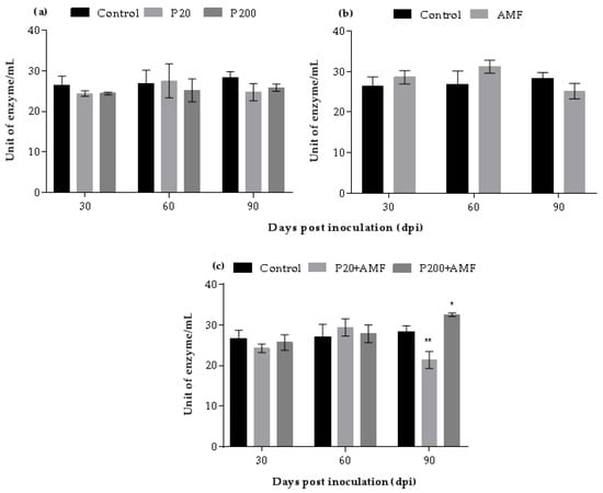 The influence of P addition and inoculation by AMF on enzymatic activity of phenylalanine ammonia-lyase was quantified. Plants treated only with P or AMF did not display variation in PAL activity (Figure 5a,b). However, at 90 dpi in the P20 + AMF group, there was a decrease of 24% (28.25–21.35 μU mL−1) compared to the control group. On the other hand, the P200 + AMF group had 15% increased PAL activity (28.25–32.49 μU mL−1) compared to the control group (Figure 5c).