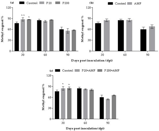 At 30 dpi, the P20 and P200 groups showed a greater variation in the amount of methyl eugenol, which was higher in the P20 (76.1–87.5%) and P200 (76.1–87.0%) groups in relation to the control group (Figure 2a, Table 4). Plants in the P20 + AMF (76.1–84.9%) and P200 + AMF (76.1–84.3%) groups had the highest concentration of this compound (Figure 2c, Table 4). The amount of the major compound, methyl eugenol, in plants inoculated with AMFs was not affected by colonization (Figure 2b).
