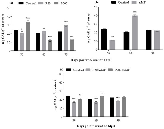 Changes in the content of phenolic compounds were observed after P addition and inoculation by AMF (Figure 3) in comparison to the control group. The levels in the plants from the P20 group were 32% higher at 90 dpi (22.50–29.76 mg GAE g−1). However, the P200 group (24.26–33.60 mg GAE g−1) showed a similar result at only 30 dpi, with an increase of 39%. At 60 dpi, both AMF (21.06–40.09 mg GAE g−1) and P200 + AMF (21.06–23.83 mg GAE g−1) groups produced a higher amount of phenolic content than the control group. On the other hand, the total phenolic content decreased, on average, by 22% in the P20 + AMF group during the experimental period.