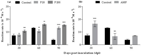 AMF inoculation increased the enzymatic activity of LOX in plants by about 129% (7.2–16.5 × 10−4 M·s −1) at 30 dpi (Figure 4b). Similarly, the combination with P addition in the P20 + AMF and P200 + AMF treatments induced the highest production of LOX at 30 (7.2–12.7, 7.2–16.3 × 10−4 M·s −1) and 90 dpi (3.8–8.3, 3.8–13.7 × 10−4 M·s −1), respectively (Figure 4c).