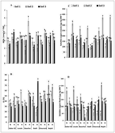 Effect of hypoxia and/or salinity stress on the content of MDA (A) and electrolyte leakage (B) in leaves of six Vicia faba seedling genotypes, the content of soluble sugars in leaves (C) and root (D) of six Vicia faba seedlings genotypes treated for 30 days on three different soils. Values are the means of three replications ± SE. The data followed by different letters are significantly different at p≤ 0.05. N—Normoxia, H—Hypoxia, Soil 1—Control, Soil 2—Saline, Soil 3—Dhari.