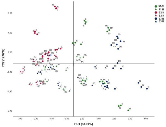 Principal component analysis (PCA) performed on six genotypes of Vicia faba under either normoxia or hypoxia defined by root dry weight, shoot dry weight, root length, shoot length, nodules number and chlorophyll content. The percentage of variation is presented on each corresponding axis. Abbreviation: S1-N—Soil 1-Normoxia, S1-H—Soil 1-Hypoxia, S2-N—Soil 2-Normoxia, S2-H—Soil 2-Hypoxia, S3-N—Soil 3-Normoxia, S3-H—Soil 3-Hypoxia. Soil 1—control, Soil 2—saline, Soil 3—Dhari. Genotypes: S—Saber 02, L—Locale, BC—Baachar, BD—Badii, CH—Chourouket N—Najeh.