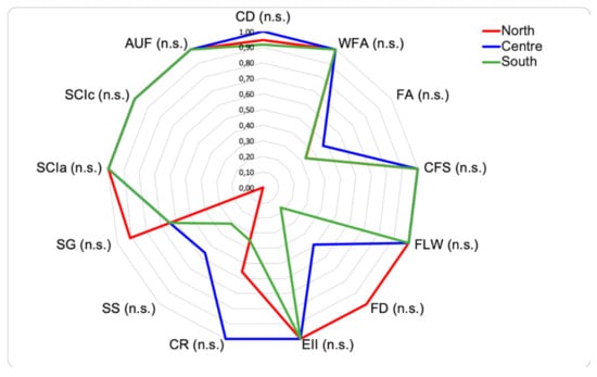 The Share species indicator presents the higher discrepancy between the farms grouped in the North, Centre and South of Italy, as illustrated in Figure 2. The average value of Share species for the farms analyzed in the North of Italy is equal to zero (Figure 2).