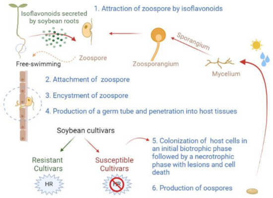 Process of P. sojae infection and response of soybean according to susceptible and resistant cultivars. The zoospores are attracted by root exudates (isoflavones daidzein and genistein), attach to the root surface and encyst before producing a germination tube entering the plant cells. If the host is a resistant cultivar, it induces hypersensitive reaction giving an incompatible interaction. Conversely, if the host is a susceptible cultivar, it triggers a wide array of biological processes following infection. The pathogen colonizes host cells in an initial biotrophic phase followed by a necrotrophic phase with necrotrophic lesions resulting in host cells death. Finally, under unfavorable conditions (low humidity and temperature) oospores are produced. These sexual spore can survive for a long time in the soil and plant debris. They can germinate and initiate a new disease cycle if the conditions are favorable for the disease development (high moisture and temperature around 25–30 °C).