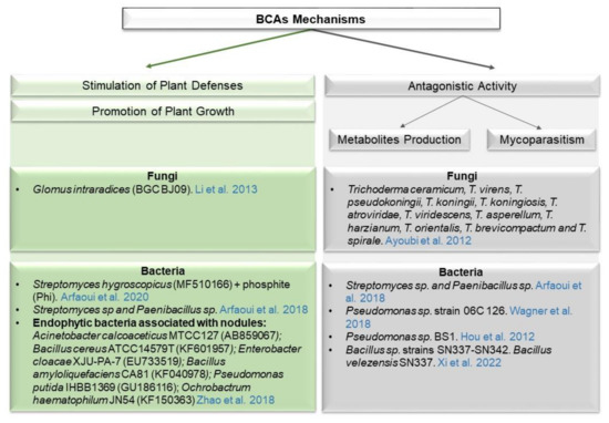 The most often reported mechanisms used by BCAs to protect the plant from pathogens include: competition for infection sites, competition for substrate, antibiosis, production of siderophores, mycoparasitism, production of cell wall degrading enzymes, and the induction of the plant immune resistance. In most of the cases, more than one of these mechanisms can act simultaneously [97]. However, the ability of the BCAs to control pathogens depends on various factors, such as their capacity to interact with the plants, the pathogen itself, the soil microbiome, and many other ‘agro’-environmental factors.