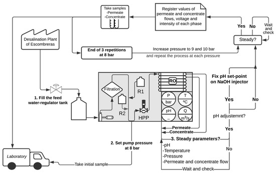 In order to analyze the effects of the variation of the water temperature on the reduction of boron, the treatments were conducted at 15, 17, 19, and 21 °C. At each temperature, the effect of the pH was evaluated at pH = 8.7, 9.5, and 11 (namely pH set-points). The pH was increased by injecting sodium hydroxide into the DSW, as shown in Appendix A. Finally, in order to assess the effect of the pressure, the trials were conducted at 8, 9, and 10 bar. Three repetitions were done for each configuration. Table 3 presents the summary of the tests performed.