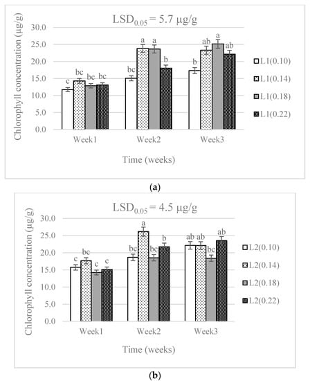There were no significant differences (p > 0.05) in the leaf chlorophyll concentrations from the different N levels. A significant effect (p < 0.05) was caused by the difference in water supply levels. The combination of water supply and N levels showed a significant effect (p < 0.05) on the leaf chlorophyll concentration (Table 1). There was a higher chlorophyll concentration in week three than in week one in all treatment combinations. The chlorophyll concentration was lowest in the 0.18 g N level and L2 combination. The 0.18 g N level was above the 0.14 g level recommended by DAFF [20], but below the highest level (0.22 g) applied in this study. The chlorophyll concentration increased with time in all treatment combinations (Figure 1).