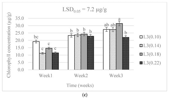 The effect of nitrogen level (0.10, 0.14, 0.18, and 0.22 g) and water supply at L1-300 mL (a), L2-600 mL (b), and L3-900 mL (c) on chlorophyll concentration of baby lettuces. Bars labelled with similar letters in each graph show no significant difference under 95% confidence interval.