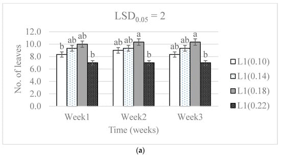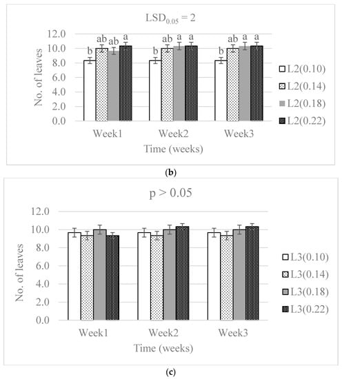 The effect of nitrogen level (0.10, 0.14, 0.18, and 0.22 g) and water supply at L1-300 mL (a), L2-600 mL (b), and L3-900 mL (c) on the development in the number of baby lettuce leaves. Bars labelled with similar letters in each graph show no significant difference under 95% confidence interval.