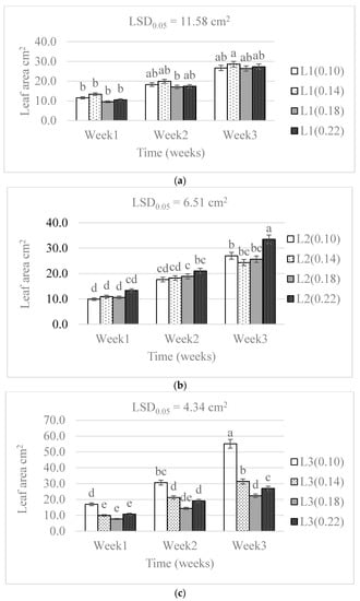 The effect of nitrogen level (0.10, 0.14, 0.18, and 0.22 g) and water supply at L1-300 mL (a), L2-600 mL (b), and L3-900 mL (c) on the development in leaf area of baby lettuces. Bars labelled with similar letters in each graph show no significant difference under 95% confidence interval.